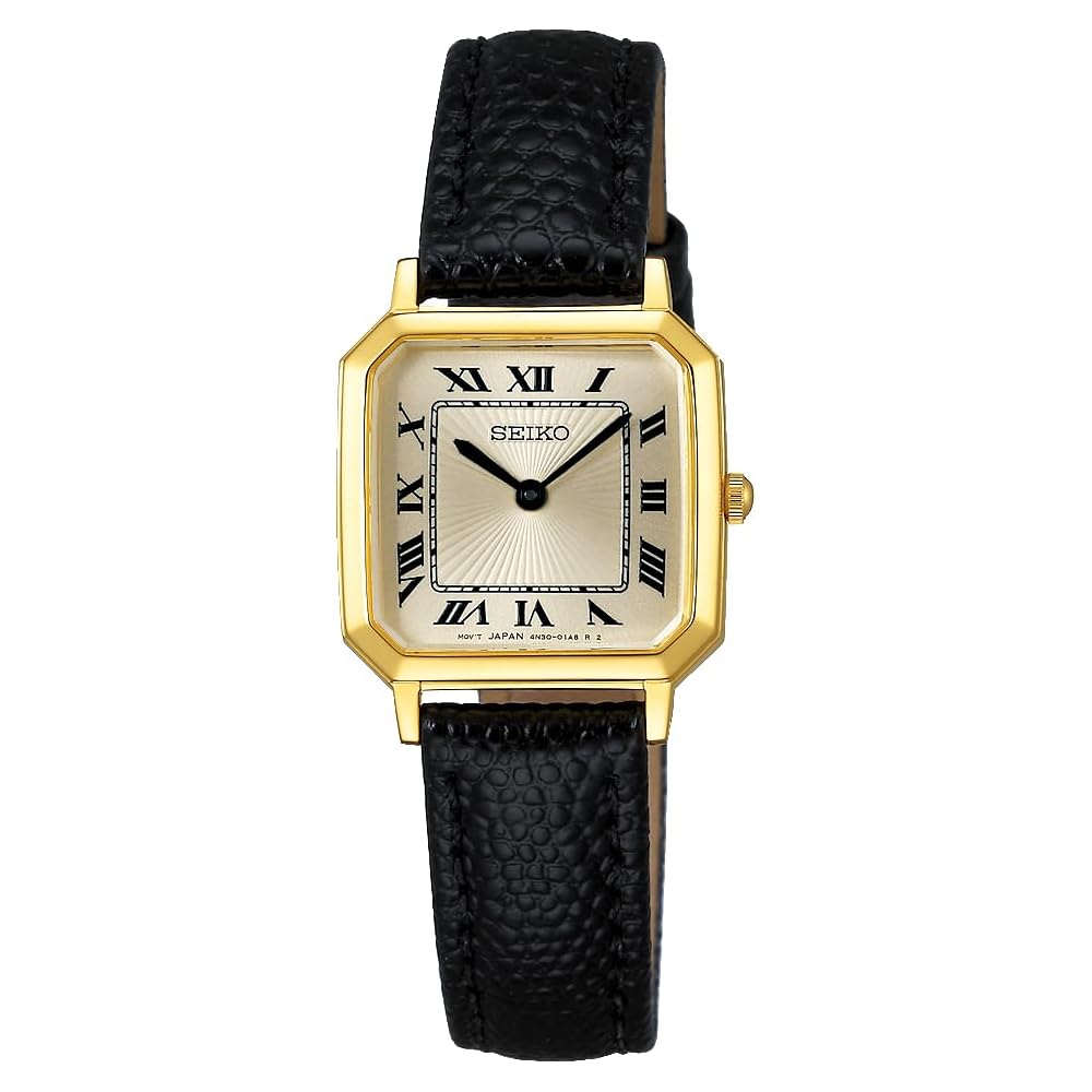 Seiko Selection SSEH018 Women's Quartz Watch Yellow Gold Leather Strap Black Square