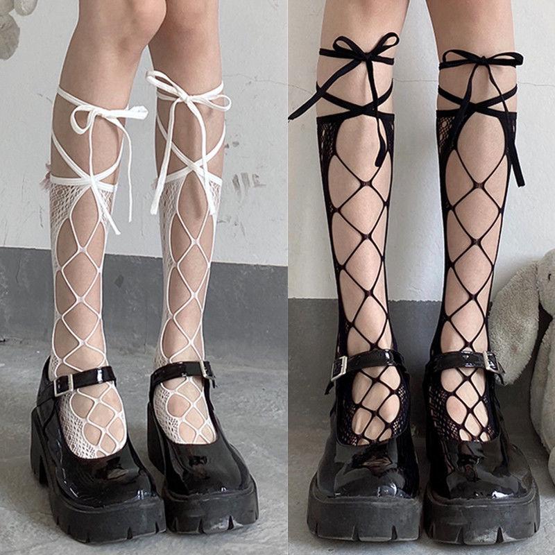 Lolita White Lace-Up Hollow-Out Mid-Calf Summer Socks