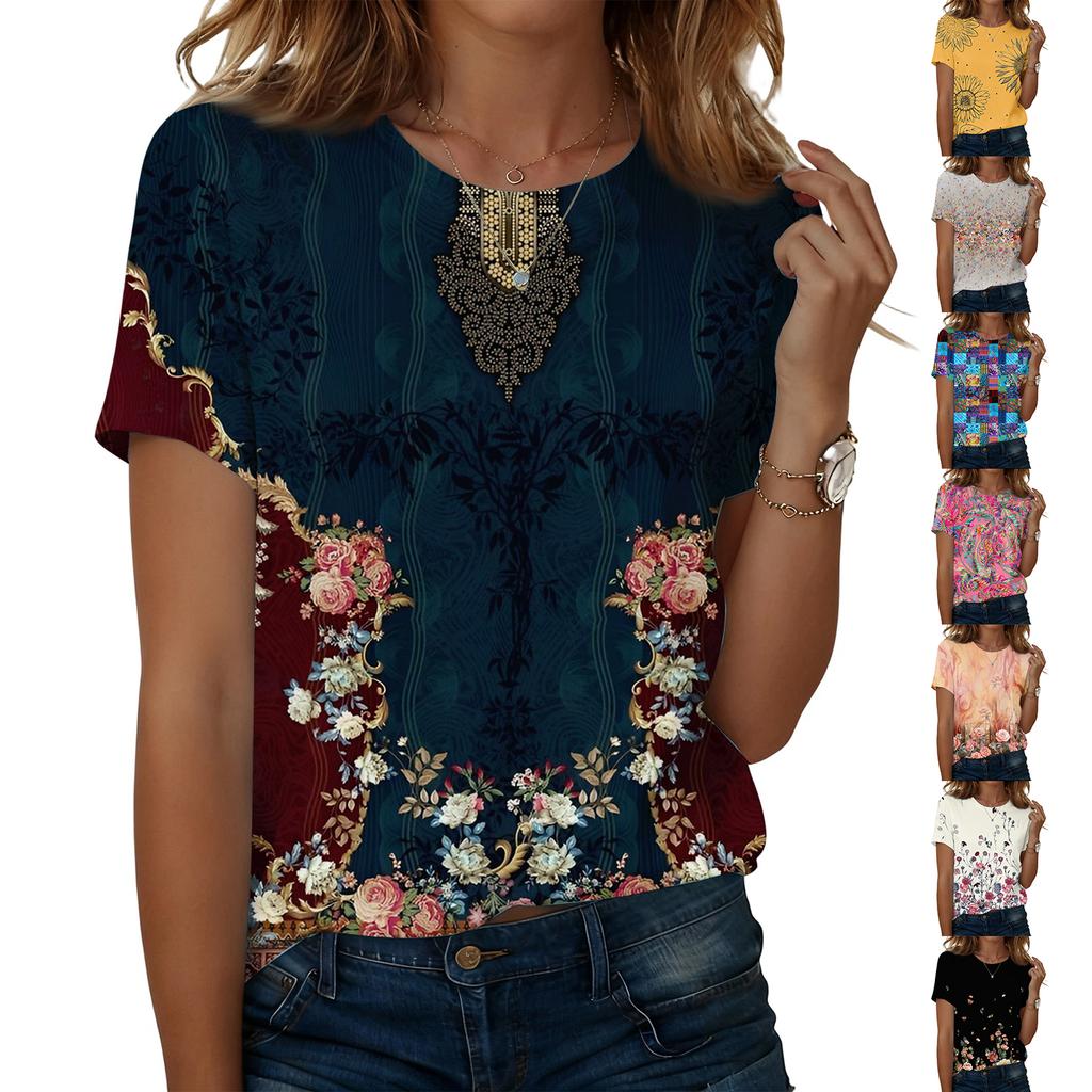 Women's Fashionable Casual Short-sleeved, Retro Printed Round-neck Top