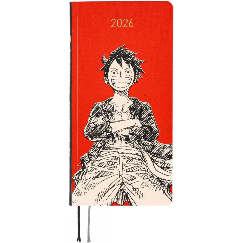 The Hobonichi 2026 Weekly English Edition One Piece Magazine/Straw Hat Luffy Red January Beginning Weekly Note is a uniquely designed slim vertical notebook featuring the main character Luffy from 'One Piece' set against a sophisticated red background. This notebook is designed to help easily record weekly plans.