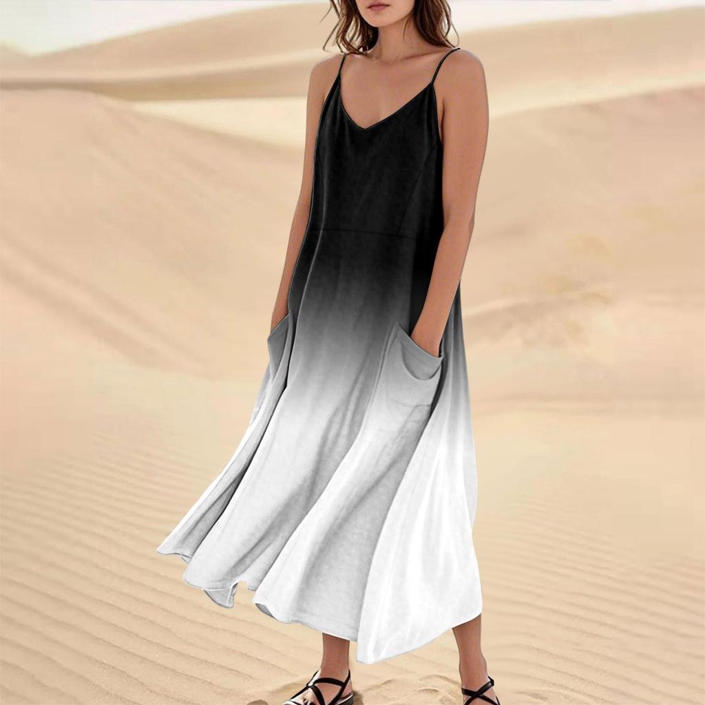 Women's Casual V Neck Gradient Print Sleeveless Pocket Suspender Dress