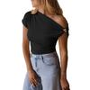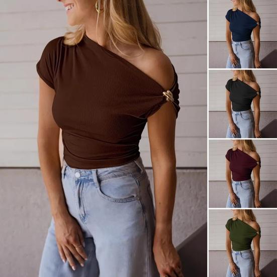 Women T-shirt Soft Stretchy Regular Fit Sloping Shoulder Short Sleeve Pullover Tops with Metal Design Party Vacation Casual Wear