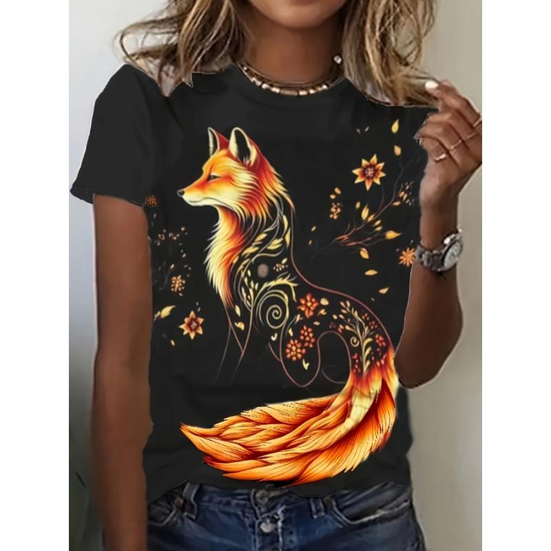 Ladies' Casual Short Sleeved Top, 3D Fox Design, Essential for Spring and Summer
