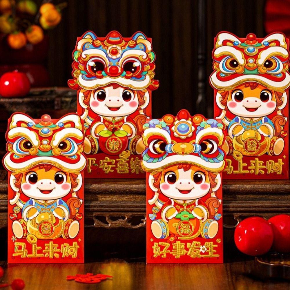6pcs Cartoon New Year Red Envelopes Traditional Hongbao Spring Festival Red Packets 2026 Horse Year Blessing Words Red Bag