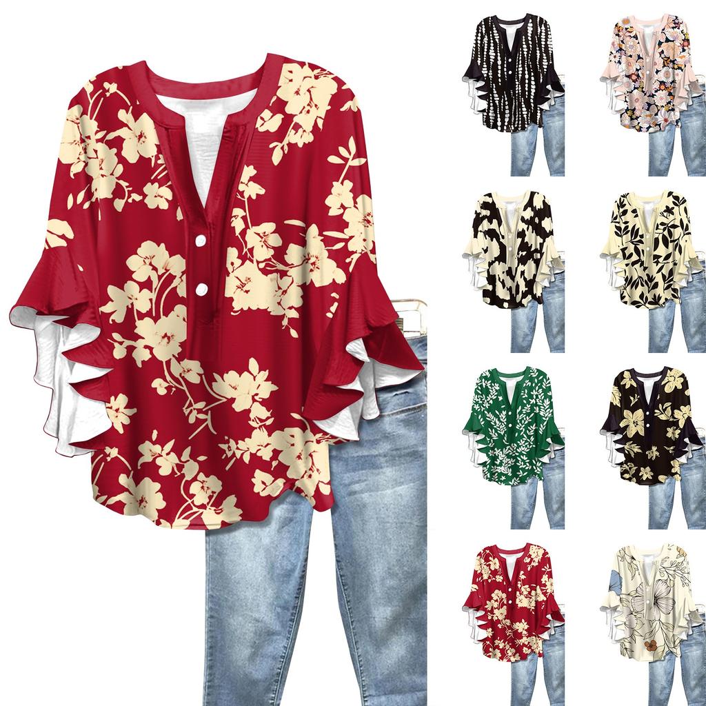 Summer Tops For Women Cute V Neck 3/4 Sleeve Blouses Floral Print Top Casual Shirts