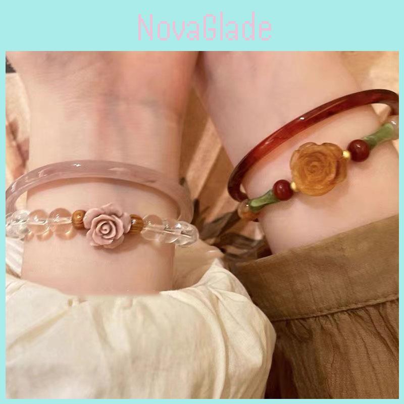 Each bracelet is meticulously fashioned by skilled artisans, ensuring that every detail reflects the highest standards of craftsmanship. The geometric shapes of these jewelry pieces add a contemporary twist to traditional elements, while the enchanting rose motif embodies romance and grace. The Rose Blossom Beaded Bracelet features delicate rose beads that dance in the light, creating a visual symphony of color and movement. Meanwhile, the Camellia Glass Bracelet boasts intricately designed camellia flowers that capture the essence of natural beauty, rendered in stunning colored glaze to evoke a sense of sophistication and allure.