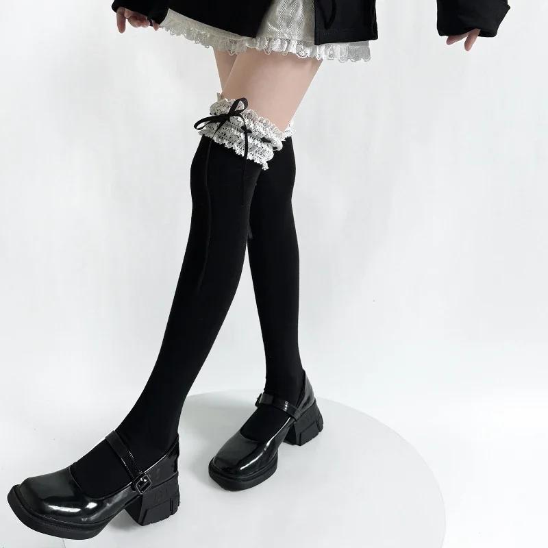 Sweet Girls Long Socks Stockings Women Bandage Ribbon Bow Knee High Socks Thigh High Stockings Lolita Lace Ruffle Socks Stocking