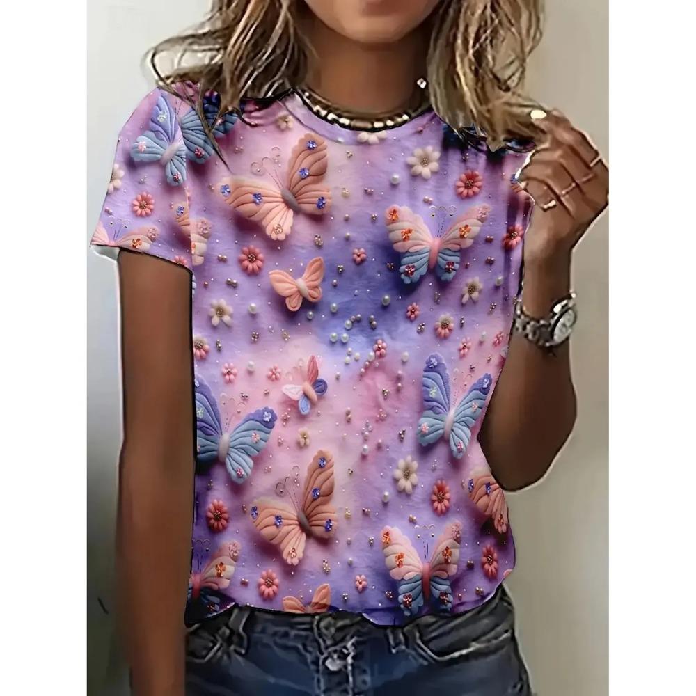 Floral Butterfly 3D Print T-Shirts Women's Casual Short Sleeve Round Neck T Shirt Street Harajuku Tees Y2k Tops Female Clothing