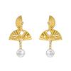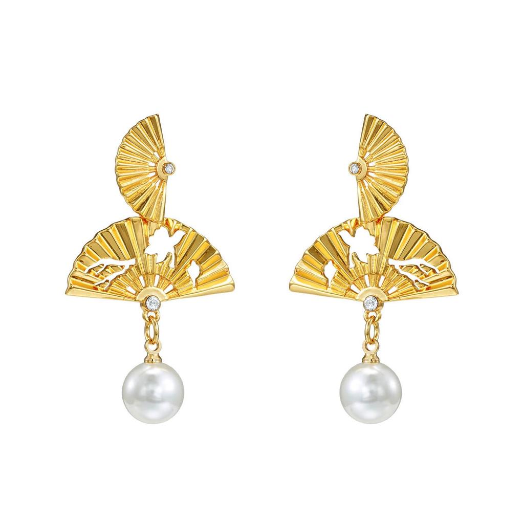 Chinese Double Layer Gold Fan Tassel Pearl Earrings with Silver Studs