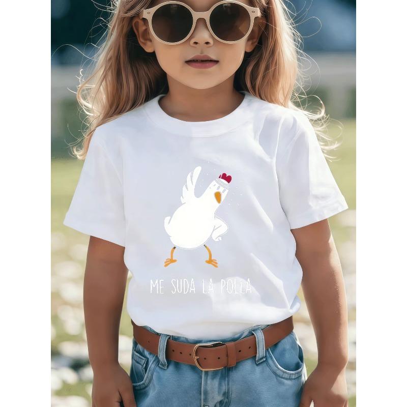 European Sizes Cartoon Funny Dancing Chick Print Crew Neck Short Sleeve T-Shirt, Casual Versatile Summer Top, Suitable Children's Daily Wear