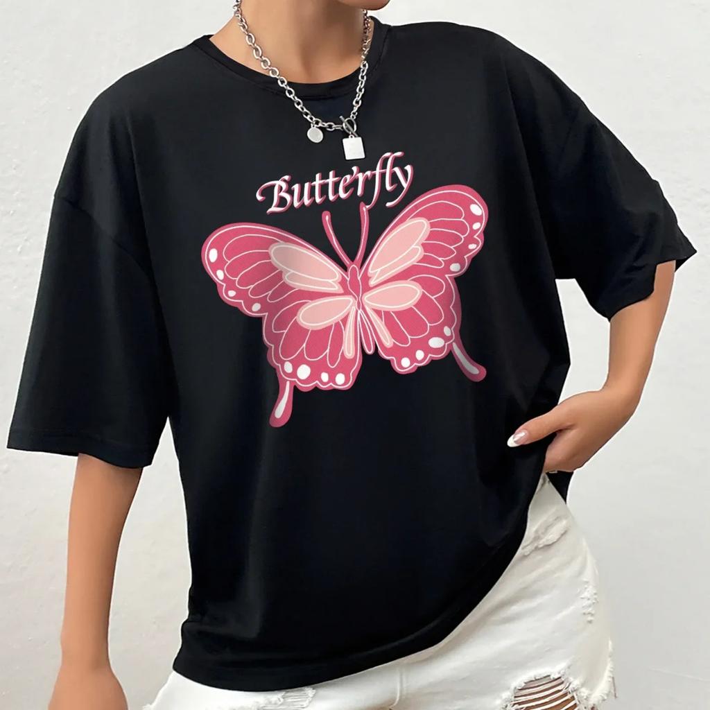 Fashionable Casual Short Sleeve T-Shirt Butterfly Print Shoulder Drop Polyester Fiber Crew Neck Short Length from China
