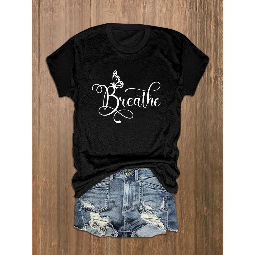 Plus Size Casual T-shirt, Women's Plus Butterfly & Letter Print Short Sleeve Round Neck T-shirt