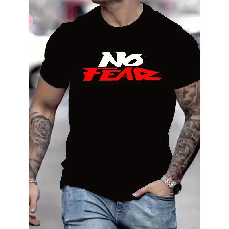 Men's "NO FEAR" Graphic T-Shirt - Bold Red Print, Black Cotton Crew Neck Tee, Street Style Summer Top, Casual & Trendy Design