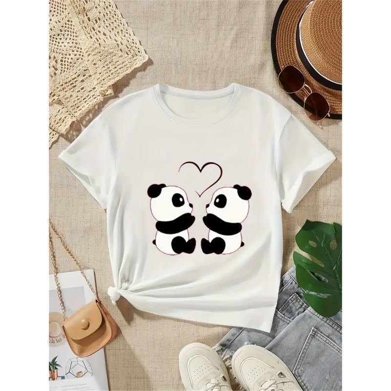 European Sizes Girls' Daily Comfort Short Sleeve T-Shirt with Panda & Heart Print, Trendy Casual Round Neck Tee for Spring and Summer