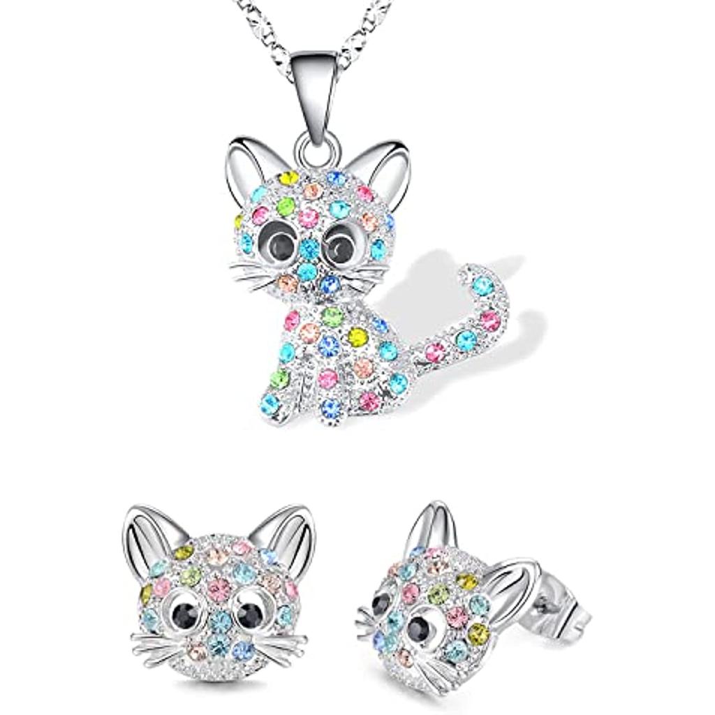 Cat Gifts for Girls Cat Necklace and Cat Earrings Set Little Girls Jewelry for Cat Lover Daughter Granddaughter, for Teenager