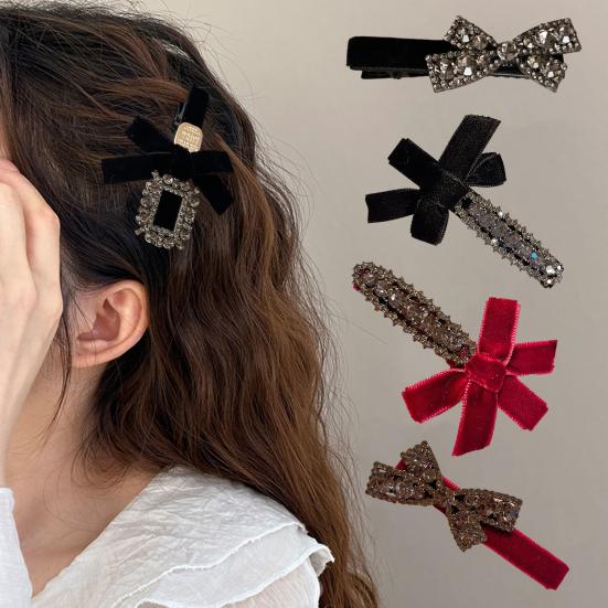 2Pcs Hairpin Velvet Bow Decor Hair Clip with Rhinestones Stable Clamping Force Bangs Hair Pin New Year Hair Accessory