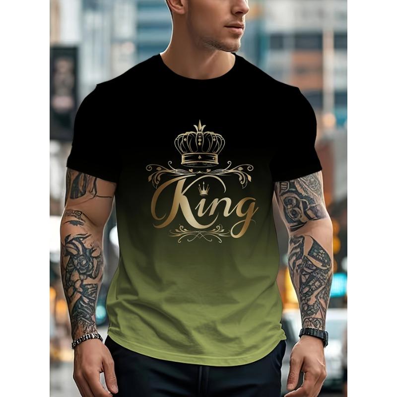 Summer Men's Gradient Color Printed with KING Pattern Round Neck T-shirt