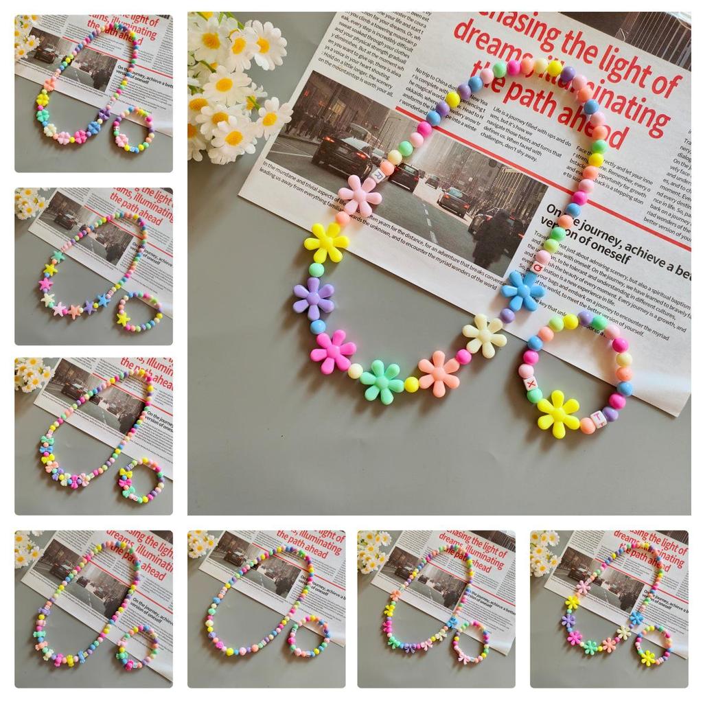 Korean Cartoon Kids' Candy Color Beaded Necklace & Bracelet Set with Flower Bowknot & Hanger