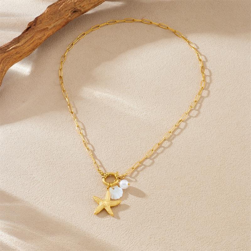 18K Gold Plated Starfish Shell Pearl Paperclip Chain Necklace, Boho Beach Pendant Necklace for Women, Summer Jewelry