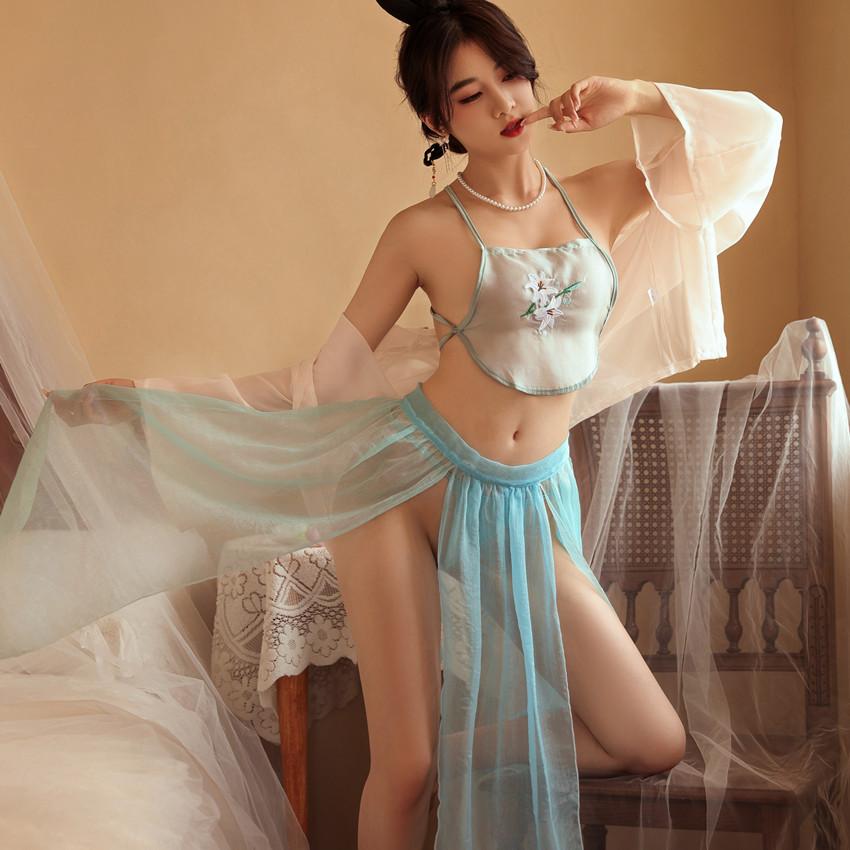 Classical Belly Pocket Chiffon Perspective Uniform Temptation Sex Suit Hot Pure Desire Light Yarn Antique Embroidery Sex Pajamas