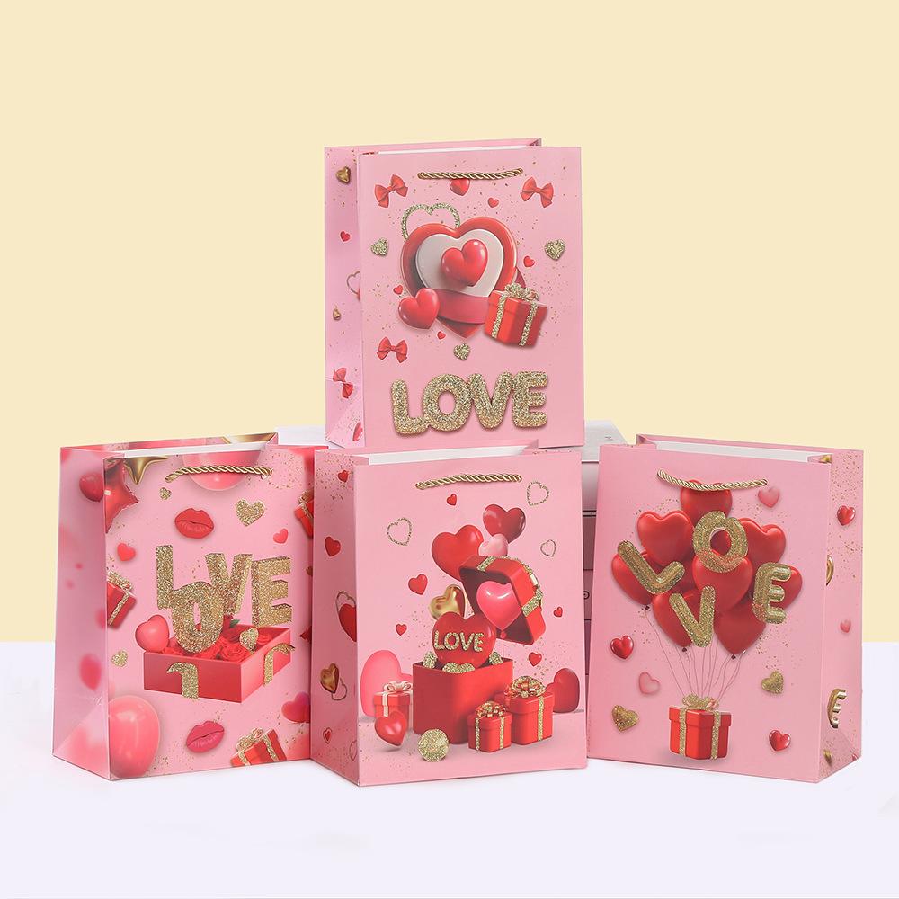 12pcs Valentines Day Gift Tote Bags Pink Hearts and Balloons Paper Present Bags Romantic Party Favor Shopping Bags