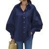 Women Solid Color Button Down Shirt Lantern Sleeve Loose Casual Blouse
