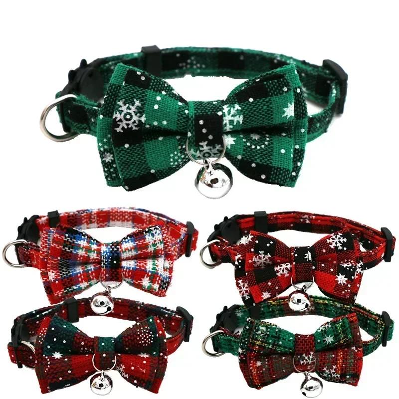 Bowknot Cat Small Dog Collar with Bell Plaid Snowflake Adjustable Breakaway Pet Puppy Kitten Safety Buckle Necklace Christmas