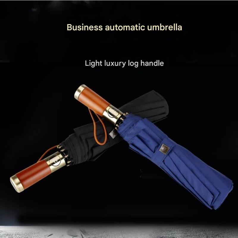 High-end Solid Wood Short Handle Umbrella Fully Automatic Reinforced Windproof Rainproof Enlarge Business Advertising Umbrella