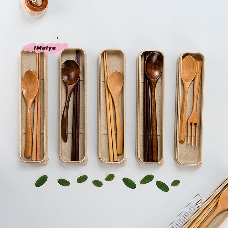 1 Set Handmade Natural Wooden Dinner Kit with Spoon Fork Chopsticks - Kitchen Accessories Storage Box