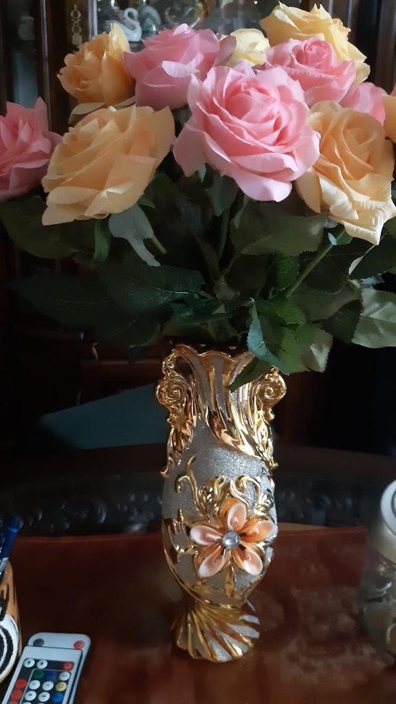 Vask on raske ja suur, valmistatud keraamikast. Hõbedane kivikestest telefon suure ja kauni kuldse õiega. 🤗💖🍀 Kahjuks on lill plastikust ja kivi klaasist. Arvasin, et lill on 🤔 glasuuriga maalitud. Tundub, et kunstküüned + odav klaasitükk ei muuda ilusat asja nii väärtuslikuks. 😒