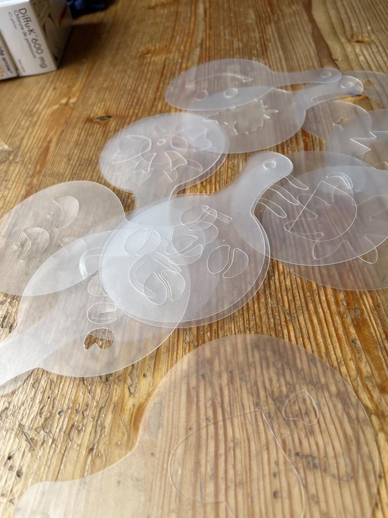 Sjablonger for å dekorere en kopp kaffe er veldig kule. Jeg kan dekorere hver kaffe som serveres til gjestene mine med et annet mønster.