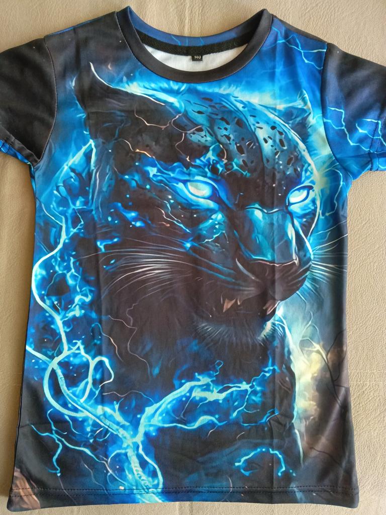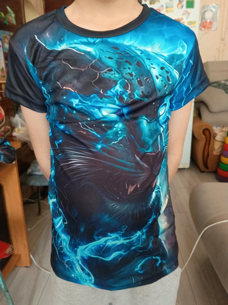 Lys T-skjorte av høy kvalitet. Sønnen gleder seg. Jeg anbefaler å ta en størrelse større (vi gjorde det) fordi det vil være skulder-til-skulder. Liten 140 cm, tok 150 cm og satte seg fint ned