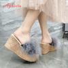 Mote Aphixta Furry Grønne Kileplattform Slides Damesko 9cm Tøfler Flip Flops Hæler Sko Strand Sandaler Pluss Størrelse 43