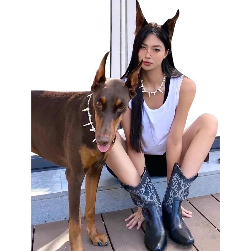 Cowhide version retro denim color matching short boots women's western boots medium tube fashion versatile British style high heel fashion boots