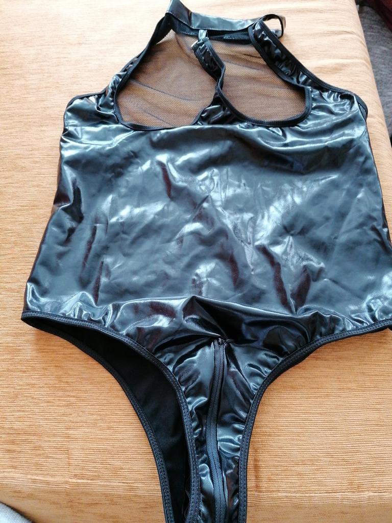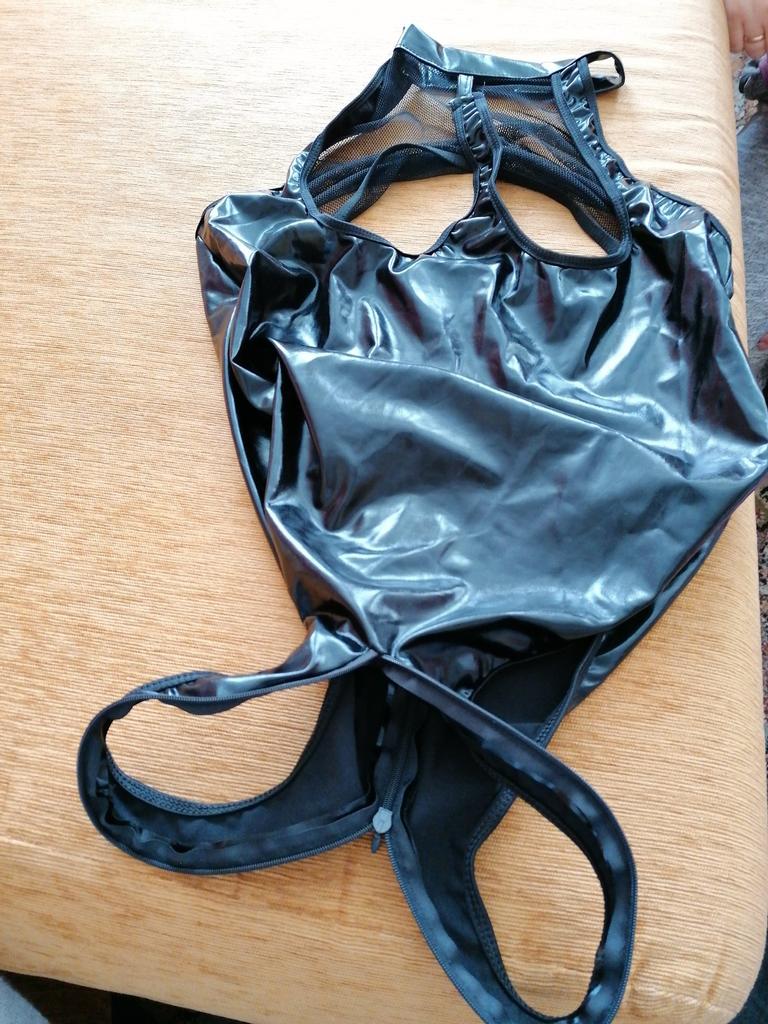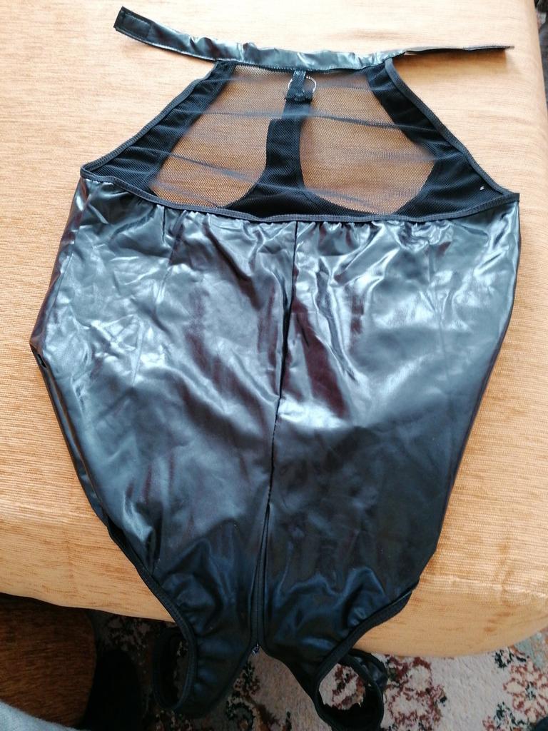 Lesklý materiál. Veľkosť 44 je plná, aj keď vyzerá ako krátky trup, a ja nie som vysoká
