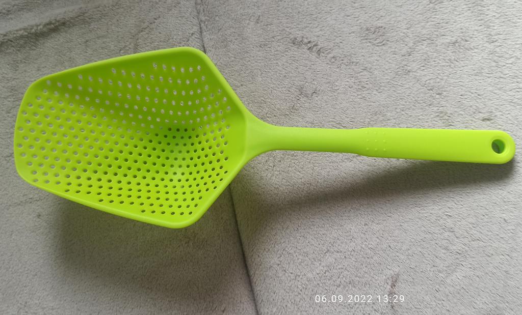 Ako som čakala na túto lopatku-cedník... A všetko márne. Tovar prišiel pokazený. Veľkosťou je dosť masívna. Myslím, že by bola pohodlná na používanie.