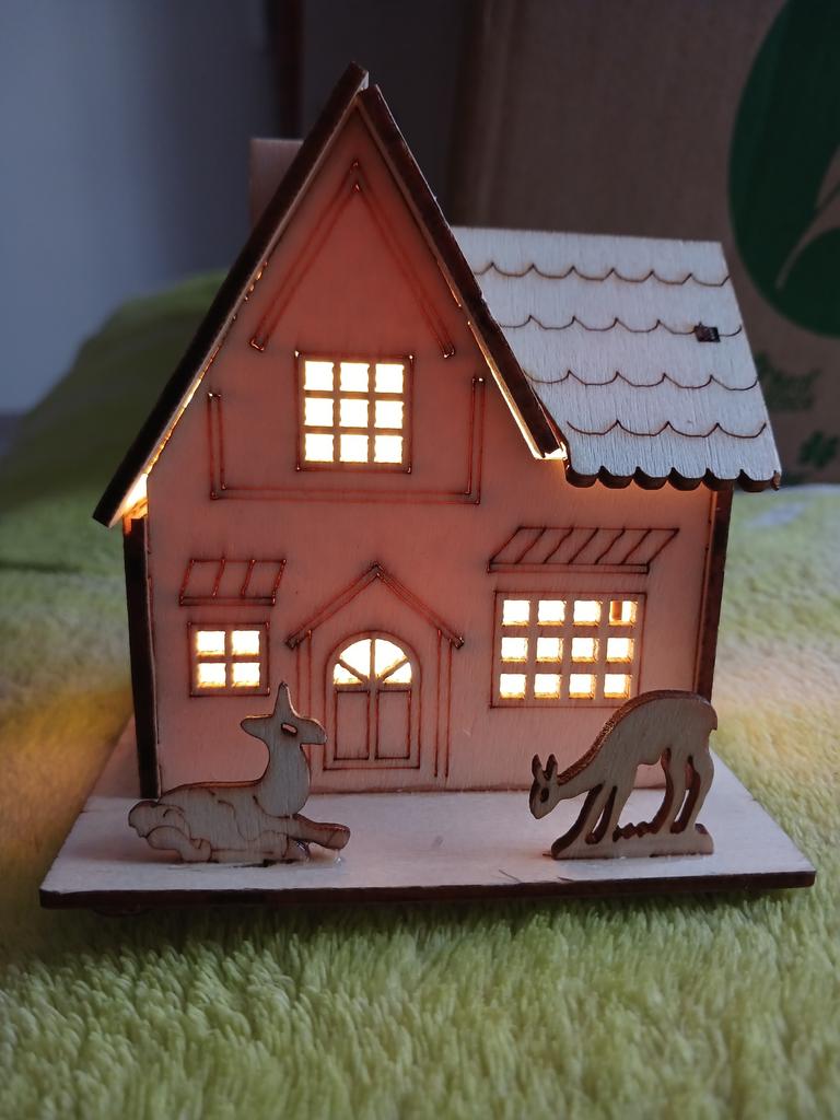 Krásny drevený domček, ako vidíte, svieti LED, ako je uvedené v krásnom a dekoratívnom popise