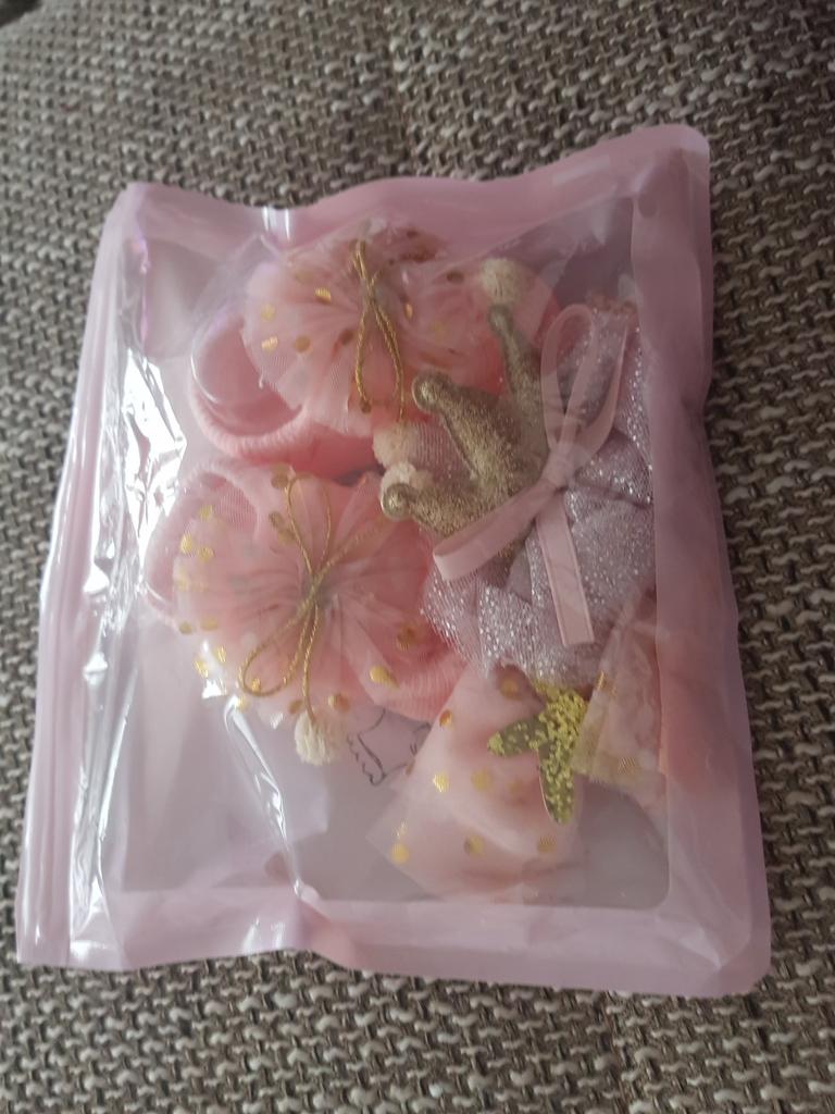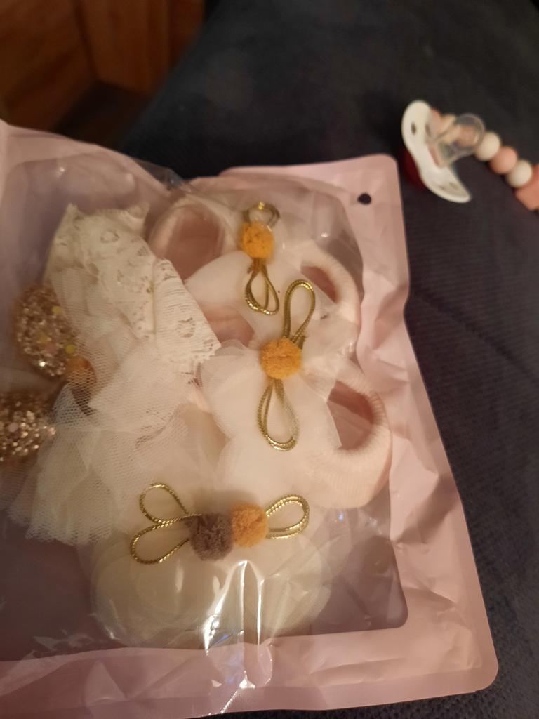 Tovar prišiel v dvoch balíkoch, nepoškodený. Súprava plne zodpovedá fotke. Veľkosť je asi dva-tri mesiace. Moj maly ma 1,5 mesiaca, takze obvazy su trosku velke, ale nie je to nic strasne. Češky sú na jej nohách akurát, ale o mesiac sa, myslím, budú dať aj utiahnuť. S produktom som úplne spokojný. Všetky mašličky perfektne držia, neošúchajú sa, stuhy sú celé, bez švu, dobre sa naťahujú a zároveň sú mäkké, aby neotláčali hlavičku.