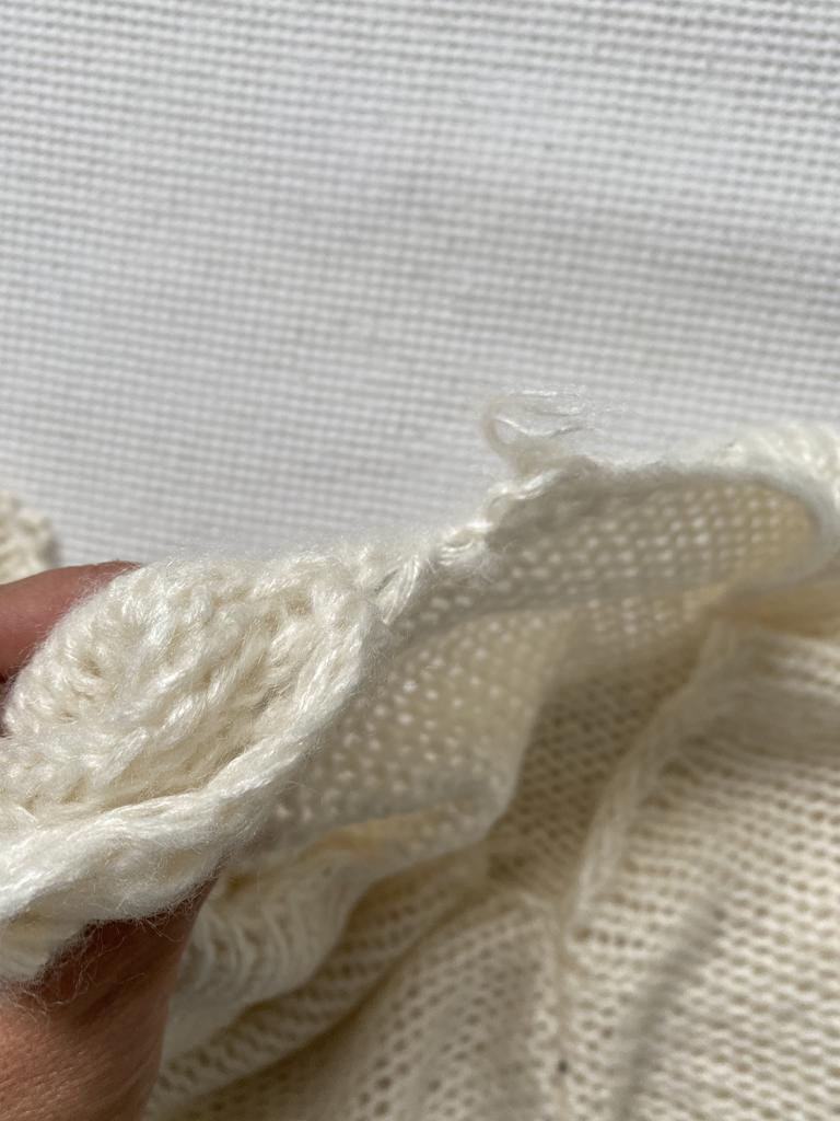 Žiaľ, hneď ako som ho (opatrne) rozbalil, bol mi na ramene vybehnutý steh. Veľkosť meraná pred objednávkou. No dobre. Pokúsim sa to opraviť a zakryť. Možno to niekomu bude vyhovovať.