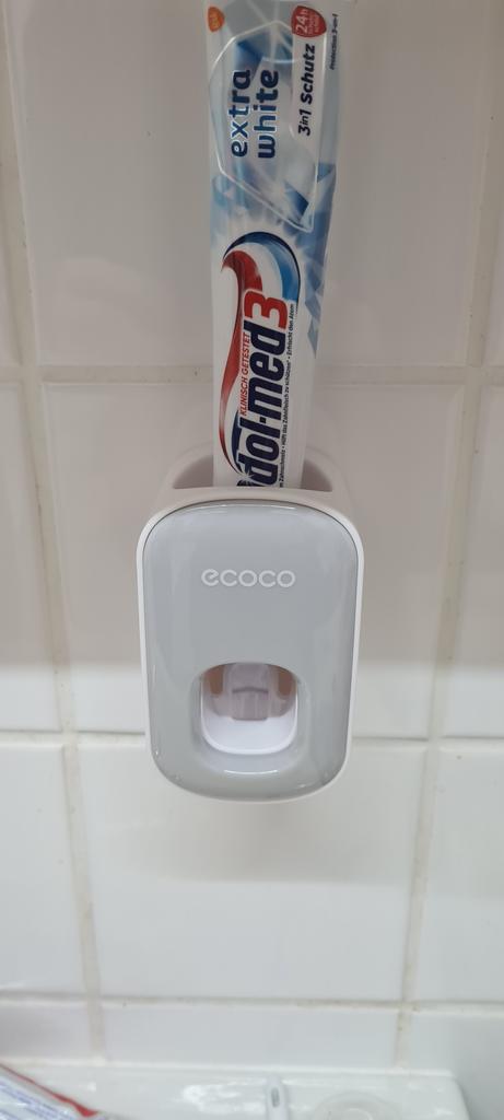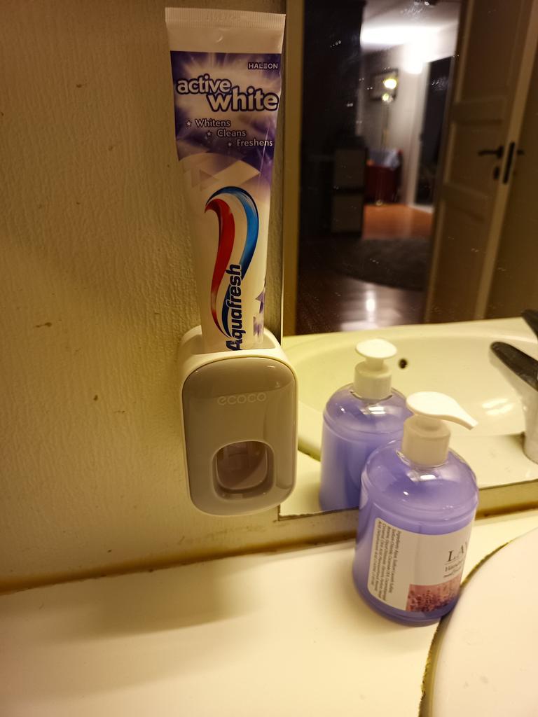 Nástenný dávkovač zubnej pasty. Funguje veľmi dobre, stačí zatlačiť zubnú kefku do zásobníka a ste pripravení ísť. Jediná vec je, že musíte mať staršie skrutkovacie vrchné viečko na zubnej paste, inak sa nezmestí do dávkovača. Našťastie sme tam jedného mali. Odporučte tieto. A nemyslite si, že majú v sebe svetlo, že nie