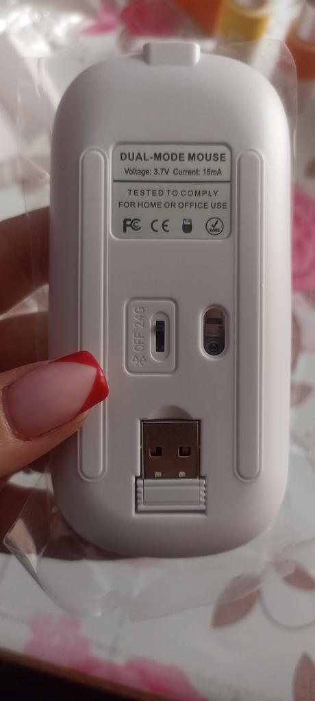 Moja dcéra používa túto myš 2 roky, žiadne sťažnosti, dala mojej vnučke notebook, potom pridala veľmi dobrú myš. Bluetooth adaptér a vstavaná batéria. Súčasťou balenia je krátky nabíjací kábel. Počas nabíjania svieti na zeleno (na obrázku) a počas prevádzky mení farby. Dobrá myš (pohodlná) a za takú cenu