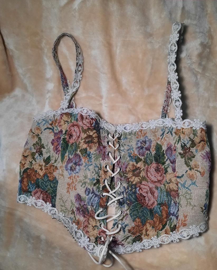 Čipkovaný top s potlačou kvetov. Ideálne k štýlovým outfitom. Top má korzetový tvar. Môžete si ho uviazať tak, ako chcete. Vyzerá krásne so šatami. naozaj radím.