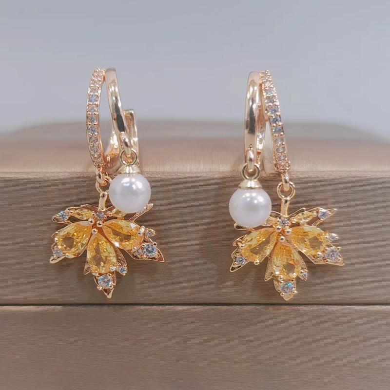 Korean Trend Zircon Red Maple Leaf Imitation Pearl Dangle Earrings for Women Fashion Statement Gold Color Earring Jewelry