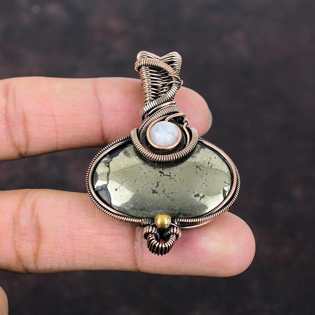 Pyrite Pendant Copper Wire Wrapped Pendant Handmade Rainbow Moonstone Jewelry Original Gemstone Pendant Gift For Mom Copper Designer Jewelry