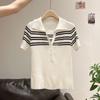 Design sense niche summer pullover polo collar shoulder striped short sleeved T-shirt short ice silk knit top for women