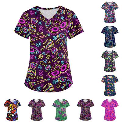 Plus Size Printed Scrub Working Uniform Tops For Women's Cross V Neck Carnival Print Short Sleeve Fun T-Shirts Workwear Tee With Pockets