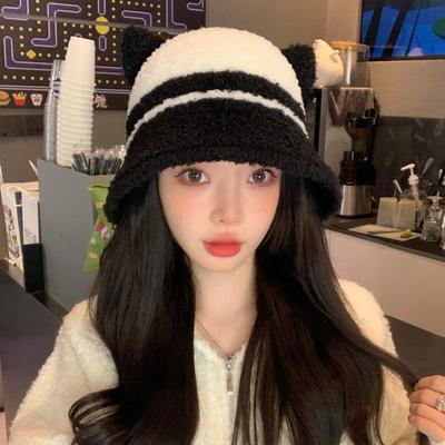 Hat Female Cute Bear Two-color Splicing Bucket Hat Winter Warm Show Washbasin Hat Thick