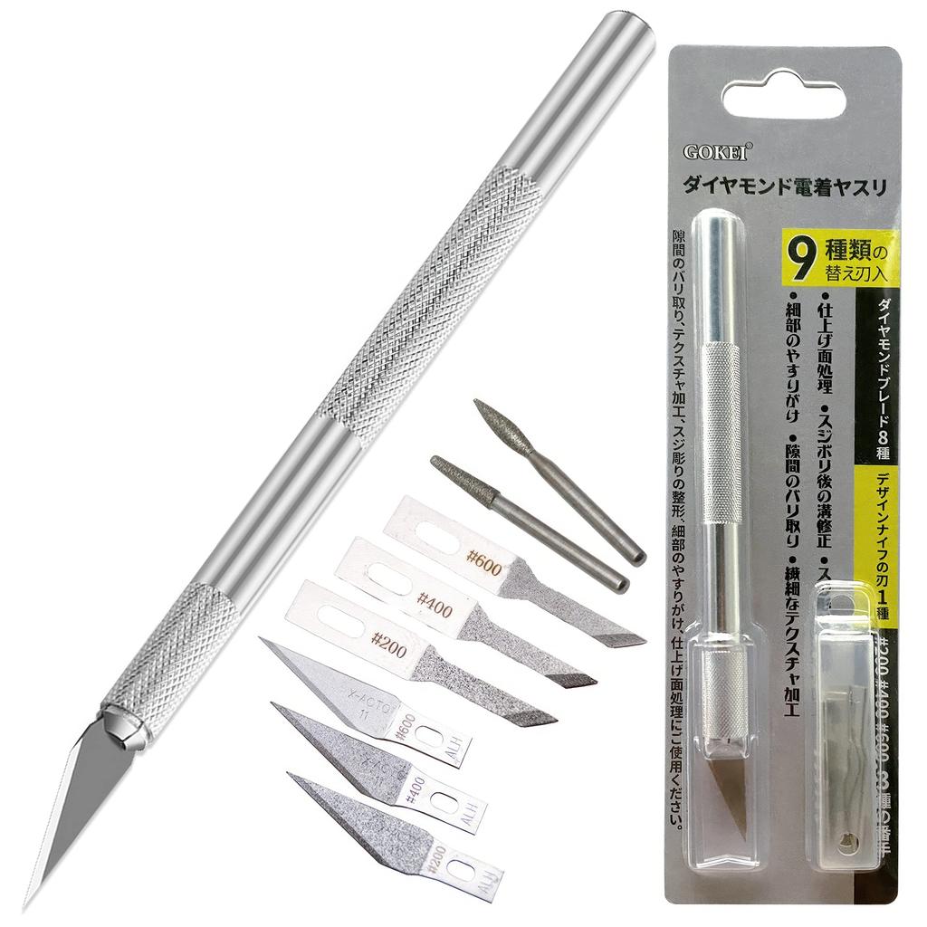 ✅ [Diamond electroplated file & 9 blades] Package contents: File holder *1, 9 blades (9 types of replacement blades included), case (for holding blades) *1, cap *1 8 types of diamond blades (taper 23°/taper 45° triangular/round type #200/#400/#600 count) + 1 type of design knife blade *Collet installation size for 2.35 mm shaft (approximate): 2.1 ~2.5mm shaft Body: Aluminum alloy Collet: Brass Protective cap: ABS There are three types of counts: #200, #400, and #600, and they can be used depending on the purpose. It has enough cutting power for small areas. A diamond electrodeposited file with the same shape as the design knife. *Please refer to the instruction manual for how to replace the blade. ✅ [Characteristics of diamond file] Ultra-thin 0.4-0.5mm thick, thin enough to fit into the crevices of fine molded products that are difficult to reach. A diamond abrasive grain with a uniform texture that provides a uniform cutting surface. Professional electrodeposition technology reduces grain shedding and provides a long-lasting cutting feel. It has superior sharpness and durability compared to conventional deburring tools. It comes with a special holder that makes it easy to grip the pencil, which is suitable for delicate surfaces, and there is no file pattern (fixed polishing direction), so you can polish in any direction. It is quite small and has a sharp tip, making it a tool that can file creases and gaps that were difficult to file with conventional files. Diamond files are compatible with: wood, paper, plastic, metal, film, etc. ✅ [Detail sanding/streaking shaping]・Deburring gaps・Delicate texture processing・Groove correction after scratching・Detailed correction・Finish surface treatment・For filing the details of hair on models and figures・Recommended as it is easy to correct curved lines. It is useful for filing gaps around the trigger guard of gunpla or machine guns on ship models, as it can be cut in just the right places. Suitable for deep areas and detailed polishing work by moving the diamond electrodeposited file back and forth on the parts you want to polish. Deburring blades can be used in a variety of ways depending on the shape and purpose, and are applied in a variety of situations. *It is not usually visible, but the number (blade with different grain size) is engraved on the blade. ✅ [Easy to use] Easy to use as it has the same shape as a familiar design knife, perfect for delicate processing of models, figures, garage kits, etc. It can be used not only for fine corrections of various molded objects that were previously difficult to process, but also for groove correction after streaks and finishing surface treatment. Ideal for detailed work such as artwork, paper cutting, cutting out cutting sheets, and processing eraser stamps! Ideal for deburring hard plastic molded products. It is also suitable for burring and chamfering nonferrous metals such as aluminum, brass, and copper. Diamond files can polish details that are difficult to remove with regular files. ✅ [Safe Manufacturer's Warranty] We carefully inspect our products, but in the unlikely event that there is a defect in the product you have purchased, we will promptly send you a good product in good faith. If the delivery date is met, we will either resend the item or refund your money. Prime products come directly from Amazon with a safe return and refund guarantee. In addition, since it is shipped from an Amazon/FBA warehouse, it is available 24 hours a day, ships on the same day, and you can specify the date and time. We apologize for the inconvenience, but please contact us through your Amazon purchase history and include your 17-digit Amazon order number. Please purchase with confidence. ■[Product introduction] This is a diamond file with diamond abrasive particles electrodeposited on ultra-thin 0.4mm thick design knife-shaped alloy tool steel. It has superior sharpness and durability compared to conventional deburring tools. It is quite small and has a sharp tip, making it a tool that can file creases and gaps that were difficult to file with conventional files. ■[Package contents] ・File body holder *1 ※Collet installation size for 2.35mm axis (approximate): 2.1~2.5mm axis ・9 blades (9 types of replacement blades included) 8 types of diamond blades (triangular/round) Type) + 1 type of design knife blade 1. Angle 23° (#200) x 1 piece 2. Angle 23° (#400) x 1 piece 3. Angle 23° (#600) x 1 piece 4. Angle 45° (#200) x 1 piece 5. Angle 45° (#400) x 1 piece 6. Angle 45° (#600) x 1 piece 7. Round type ① (Blade length: 9mm) × 1 piece 8. Round type ② (Blade length: 9mm) × 1 piece 9. Design knife blade × 1 piece *Although it is not usually visible, the number (blade with different grain size) is engraved on the blade. ・Case (for holding the blade) *1 ・Cap *1 ■[Product material] ・Body: Aluminum alloy ・Collet: Brass ・Protective cap: ABS ■[Characteristics of diamond files] ・Fine-grained diamond abrasive grains that provide a uniform cutting surface ・Professional electrodeposition technology reduces grain shedding and provides a long-lasting cutting feel ・No file marks (fixed polishing direction) Can be polished in any direction ■[How to use] Suitable for deep areas and detailed polishing work by moving the diamond electrodeposited file back and forth on the parts you want to polish.
