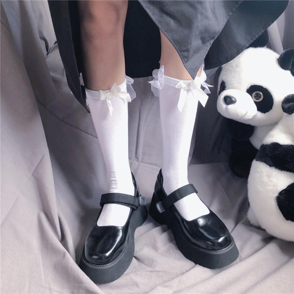 Japanese Lolita Retro White Satin Bow Trendy Cool Dark Jk Two Wear Stacked Calf Socks