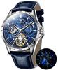 OLEVS Mechanical Automatic Manual Winding Leather Fashion Watch Leather Skeleton Moon Phase Luminous Moon Waterproof watch for men Blue Men's & Men's